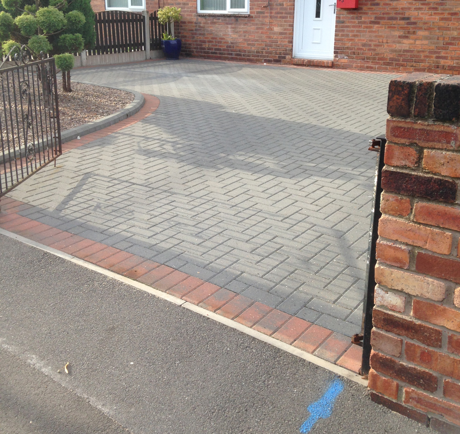 Block Paved driveway using grey block paving with red block pave edgings and kerb outer edgings.